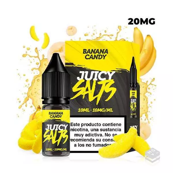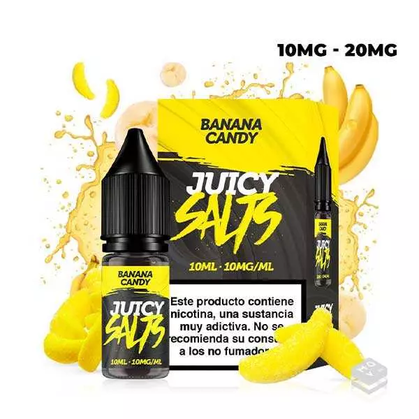 El líquido para vapear sales de nicotina Banana Candy 10ml de Juicy Salts sabe a gominola con sabor a plátano con matices de caramelo azucarado. Un sabor delicioso que rememora la infancia de muchos.