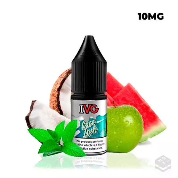 El IVG Salts Coco Lush 10ml es un líquido con sal de nicotina que busca ofrecer a los vapeadores una experiencia de vapeo refrescante y deliciosa al combinar sabores cremosos de coco con notas jugosas y frutales de sandía y manzana, todo culminando en un toque de mentol.