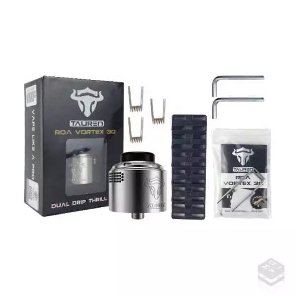El Tauren Vortex RDA 30mm es un RDA robusto e innovador, diseñado para vapeadores que buscan alto rendimiento, precisión en el sabor y una experiencia DL suave. Sus características avanzadas y su calidad de construcción premium lo convierten en una opción destacada para los entusiastas del vapeo.
